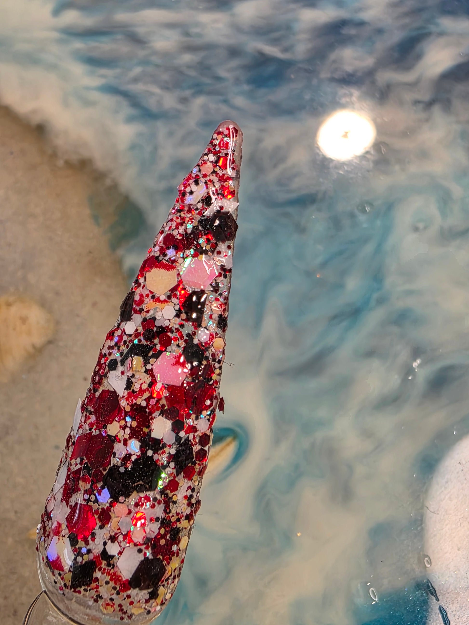 Glitter mix of red, white and black with triangle glitter & flecks. Make sure to enter the True Crime Mani Contest by February 20th.