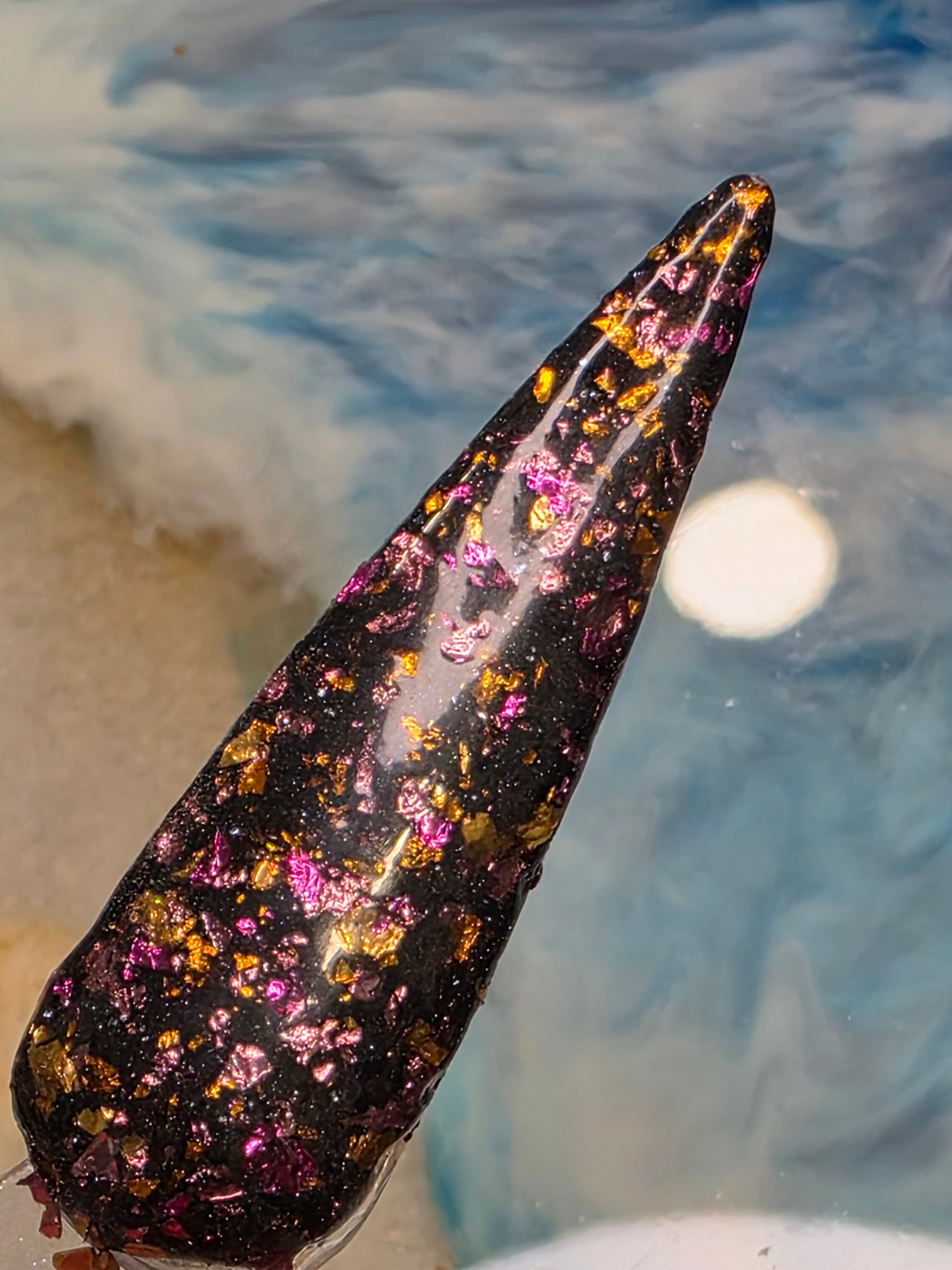 Black base color with copper, yellow and dark and light pink foils