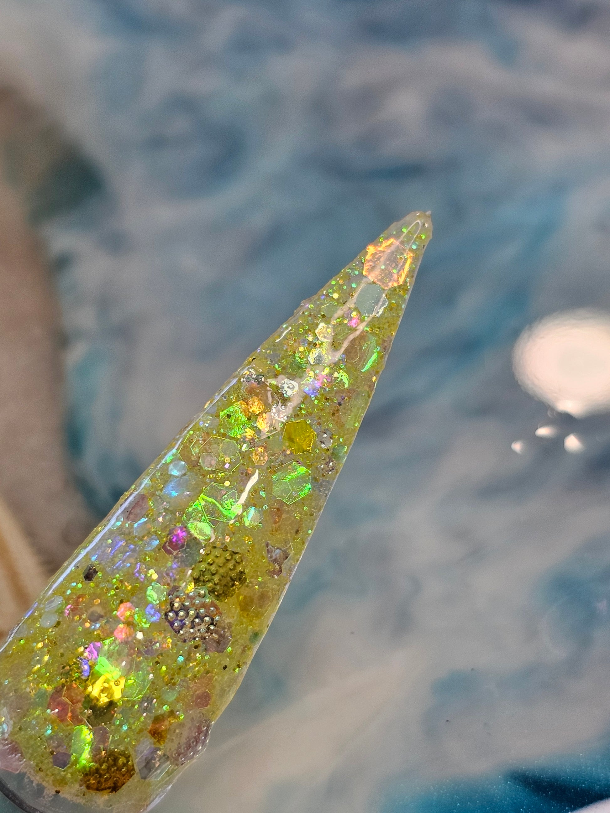 Iridescent fine glitter with Chameleon yellow/green/pink glitter mix and yellow textured glitter