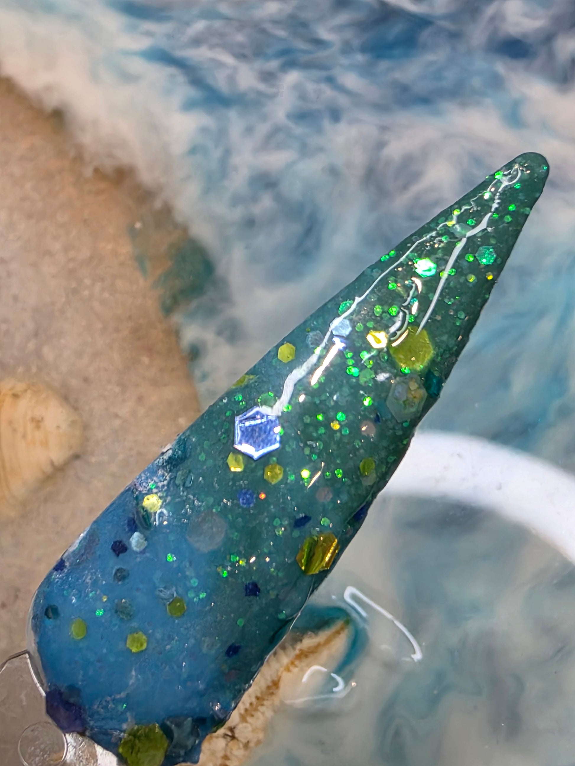 Turquoise to green reverse thermal with blue & gold glitter. Turquoise when warm to green when cold.
