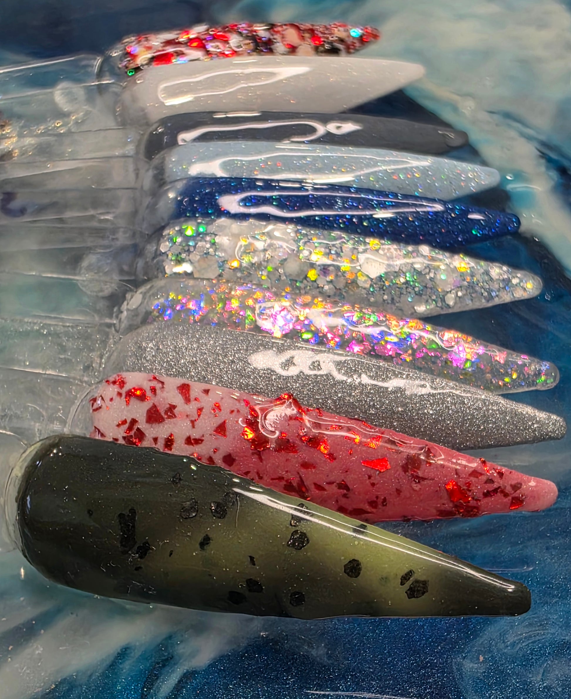 True Crime Collection includes 10 dips - 10G or 3G colors, Crime Scene, Luminol Glow, Interrogation Room, Cold Case, Midnight Alibi, Jane Doe, The Evidence, Murder Weapon, Blood Splatter-Thermal & Caution Tape-Thermal. Make Sure to enter the True Crime Mani Contest by February 20th!